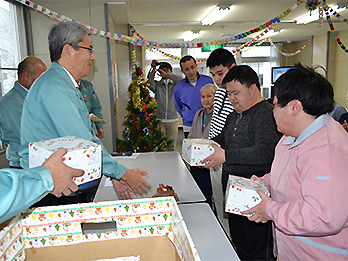 フジクラ電装は、毎年、従業員が空き缶やペットボトルを家庭から持ち寄り、リサイクル業者に売却した代金をもとに、知的障がい者施設「さくらんぼの家」の入居者の皆様にクリスマスのプレゼントを贈っています。今年も社員6名が訪問し、プレゼントを贈りました。 |