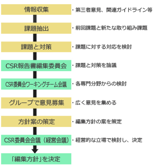 当社グループは、次期報告書の検討を進めるにあたり、当報告書の作成過程で出てきた課題や第三者意見などの専門家のご意見、また、ステークホルダーからのご提言、関連のガイドラインの動向等の情報を集めることからスタートしました。その後、報告書の編集会議、CSR委員会の専門委員会、そして経営者で構成するCSR委員会(経営会議)での論議を経て、次期CSR報告書の「編集方針」が決定されました。情報収集から「編集方針」決定までは期間にして約6ヶ月です。